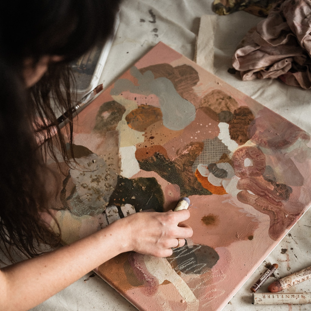 Ich arbeite mit Malerei, Mixed Media, natürlichen Materialien und textilen Elementen. Am liebsten in erdigen Tönen, die nicht schreien, aber nachhallen.